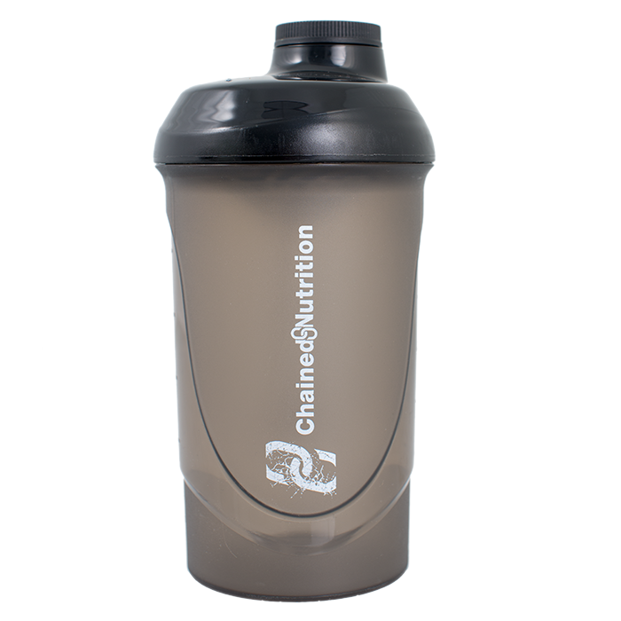 Praktisk og stilren shaker fra Chained Nutrition med robust lokk, smidig skruvkork og logo-trykk.